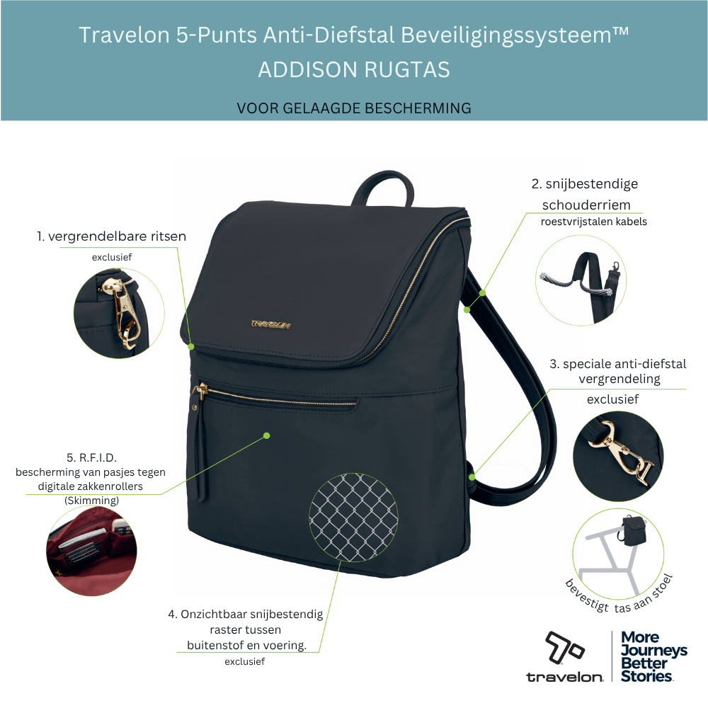 We kennen het gevoel maar al te goed: de voorbereiding op een dagje uit, een festival, of een nieuwe stad kan stressvol zijn. Je bent constant bezig met het in de gaten houden van je tas, en dat gaat ten koste van het genieten. Precies daarom zijn we zo enthousiast over de Addison Backpack uit de toonaangevende anti-diefstal collectie van Travelon.