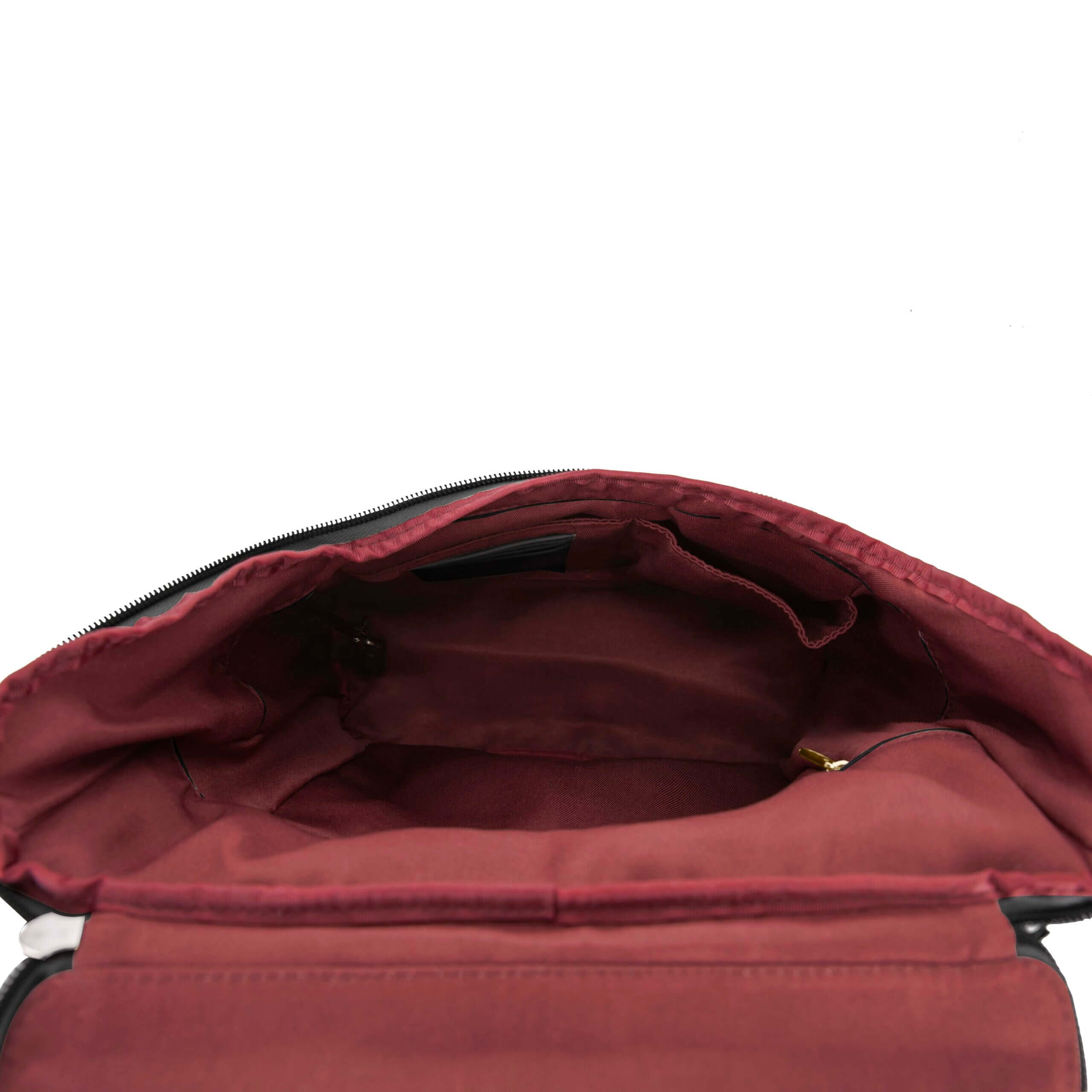 - Lock-Down Riem (lees meer): De schouderriem kan losgeklikt en rond een vast object (zoals een stoel of bank) worden vastgezet. Dit voorkomt dat een dief de tas grijpt en wegloopt.