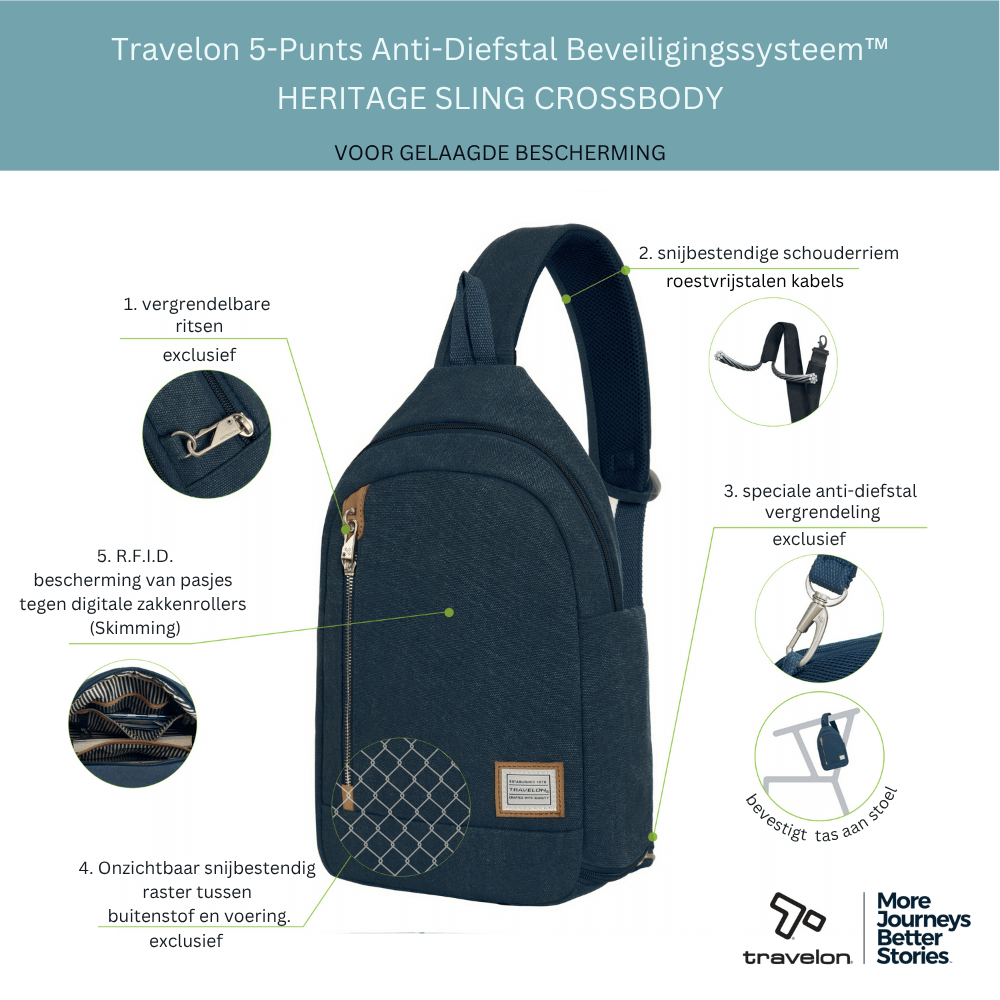De Heritage Sling combineert een tijdloze, casual look met de modernste anti-diefstal technologie. Dit is de ideale tas voor de reiziger of forens die op zoek is naar gemak en veiligheid. Je draagt de tas comfortabel over één schouder, of diagonaal over je borst. Je hebt al je spullen binnen handbereik. De Heritage Sling is de perfecte oplossing als je een compacte, stijlvolle tas wilt die toch maximale bescherming biedt.