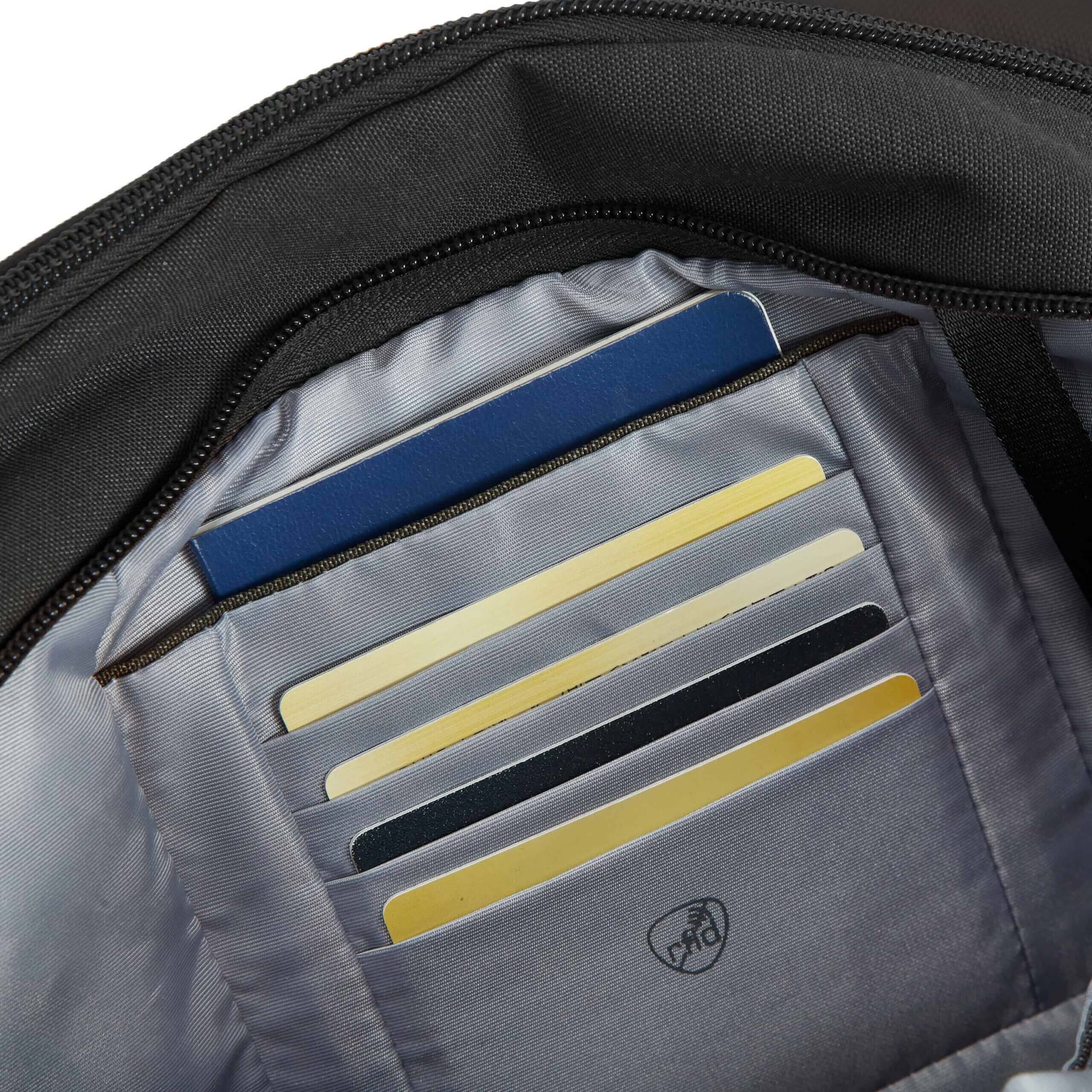- Snijbestendig Body (lees meer): De stof bevat een onzichtbaar, lichtgewicht anti-diefstal raster, gemaakt van materiaal dat ook wordt gebruikt voor kogelwerende vesten. Dit garandeert bescherming tegen het opensnijden van de tas en diefstal van de inhoud.